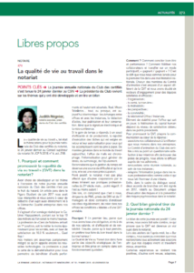 Présidente du Club des Certifiés du Notariat depuis plusieurs mois, Judith Régnier décline la qualité sur tous les fronts et défend en particulier la Qualité de Vie au Travail. Dans un article paru dans la Semaine Juridique, elle partage les points abordés lors de la Journée Nationale des Certifiés et n’hésite pas à associer la QVT aux objectifs stratégiques de l’entreprise. Placer le capital humain au cœur des préoccupations professionnelles n’étant pas le domaine réservé du Notariat, nous vous invitons à parcourir les libres propos de Me Régnier.